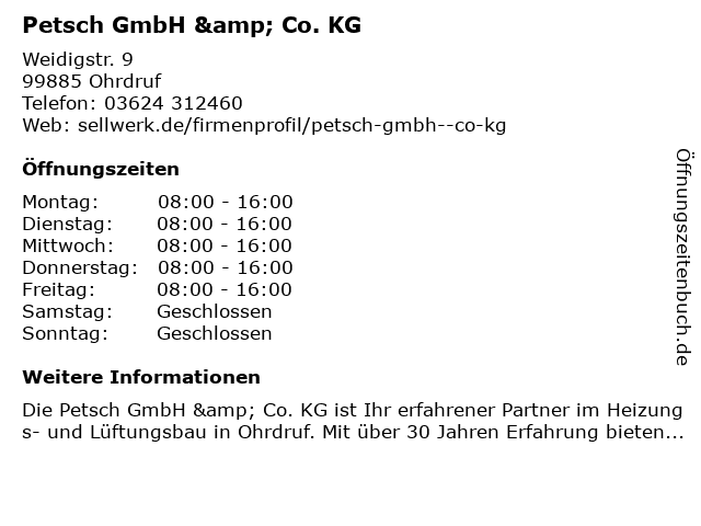 | Öffnungszeiten Petsch GmbH & Co. KG in Ohrdruf anzeigen | |