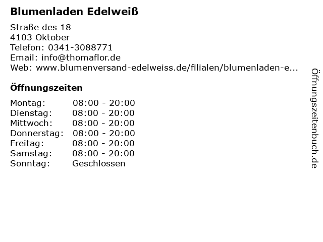 | Öffnungszeiten Blumenladen Edelweiß in Oktober anzeigen | |