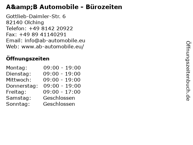| Öffnungszeiten A&B Automobile - Bürozeiten in Olching anzeigen | |