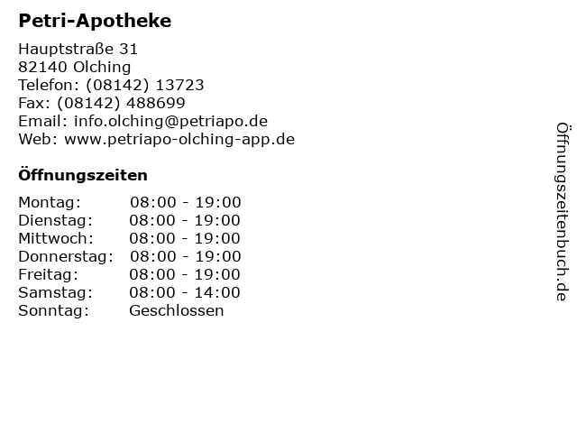 | Öffnungszeiten Petri-Apotheke in Olching anzeigen | |