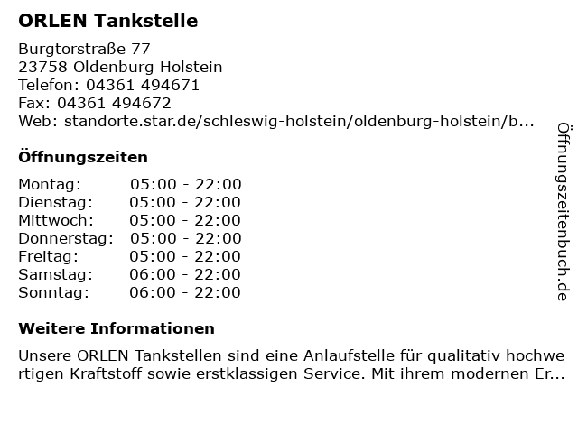 | Öffnungszeiten ORLEN Tankstelle in Oldenburg Holstein anzeigen | |