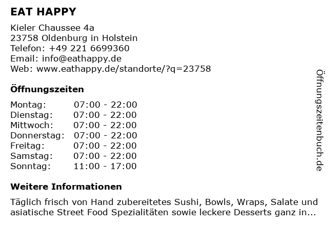 | Öffnungszeiten EAT HAPPY in Oldenburg in Holstein anzeigen | |