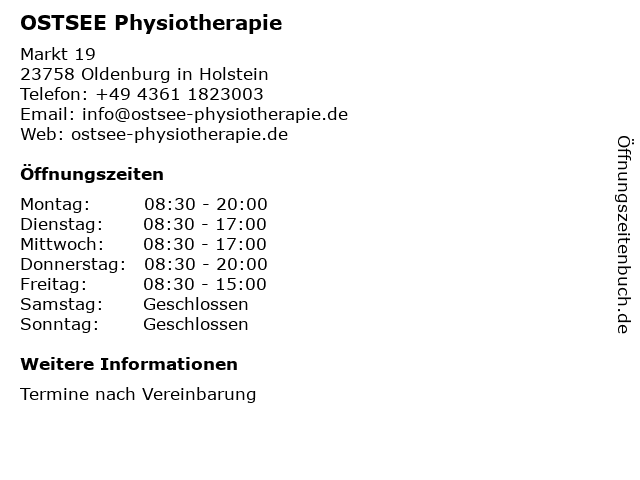 2 OSTSEE Physiotherapie, Sören Reimers (Entfernung: 0,31 km) Schuhstraße 25, 23758 Oldenburg in Holstein 6 Ostsee-Umzüge Hans-Jürgen Neumann Birgit Stamer-Neumann GbR (Entfernung: 3,76 km) Neukoppel 4, 23758 Göhl |