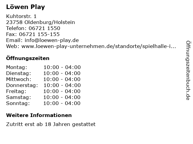 | Öffnungszeiten Löwen Play in Oldenburg/Holstein anzeigen | |
