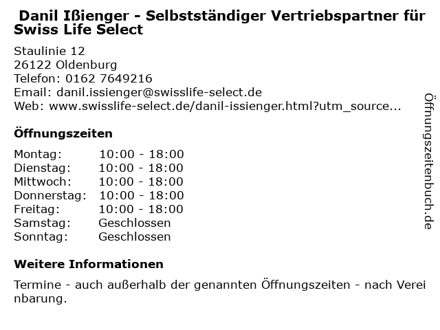 1 Sarah Engler - Selbstständige Vertriebspartnerin für Swiss Life Select (Entfernung: 0,00 km) Staulinie 12, 26122 Oldenburg 2 Lasse Janßen - Selbstständiger Vertriebspartner für Swiss Life Select (Entfernung: 0,00 km) Staulinie 12, 26122 Oldenburg 3 Torge Wessels - Selbstständiger Vertriebspartner für Swiss Life Select (Entfernung: 0,01 km) Staulinie 12, 26122 Oldenburg 4 Tobias Reuß - Selbstständiger Vertriebspartner für Swiss Life Select (Entfernung: 0,01 km) Staulinie 12, 26122 Oldenburg 5 Fynn Ole Bedenk - Selbstständiger Vertriebspartner für Swiss Life Select (Entfernung: 0,01 km) Staulinie 12, 26122 Oldenburg 6 Sebastian Titze - Selbstständiger Vertriebspartner für Swiss Life Select (Entfernung: 0,01 km) Staulinie 12, 26122 Oldenburg |
