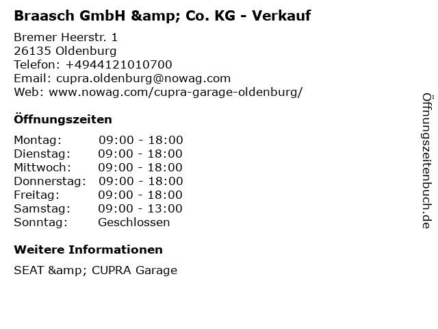 3 Braasch GmbH & Co. KG – Das SEAT Autohaus - Verkauf (Entfernung: 2,19 km) Hauptstraße 41-45, 26122 Oldenburg 4 Braasch GmbH & Co. KG – Das SEAT Autohaus - Service, Teile und Zubehör (Entfernung: 2,19 km) Hauptstraße 41-45, 26122 Oldenburg 6 |