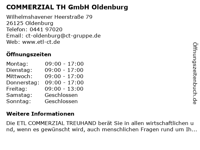 1 COMMERZIAL TREUHAND GmbH Steuerberatung und Wirtschaftsprüfung (Entfernung: 0,00 km) Wilhelmshavener Heerstr. 79, 26125 Oldenburg 2 Th. & Claus Schmidt OHG Auktionatoren & Grundstücksmakler (Entfernung: 8,22 km) Oldenburger Str. 235 a, 26180 Rastede 6 |