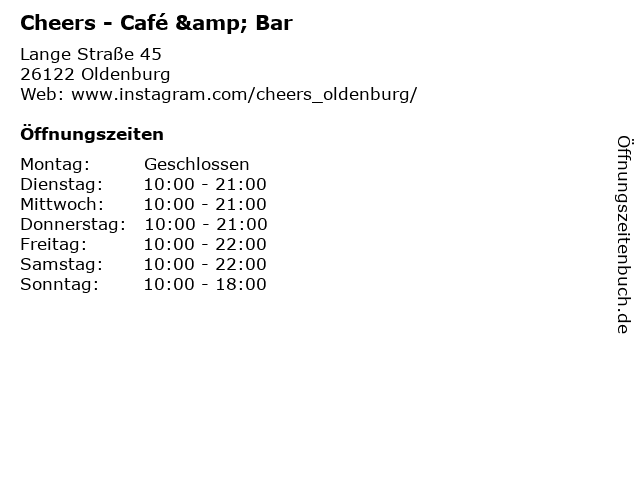 | Öffnungszeiten Cheers - Café & Bar in Oldenburg anzeigen | |