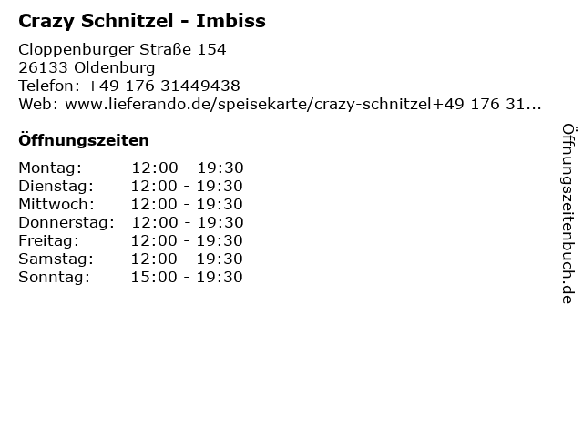 | Öffnungszeiten Crazy Schnitzel - Imbiss in Oldenburg anzeigen | |