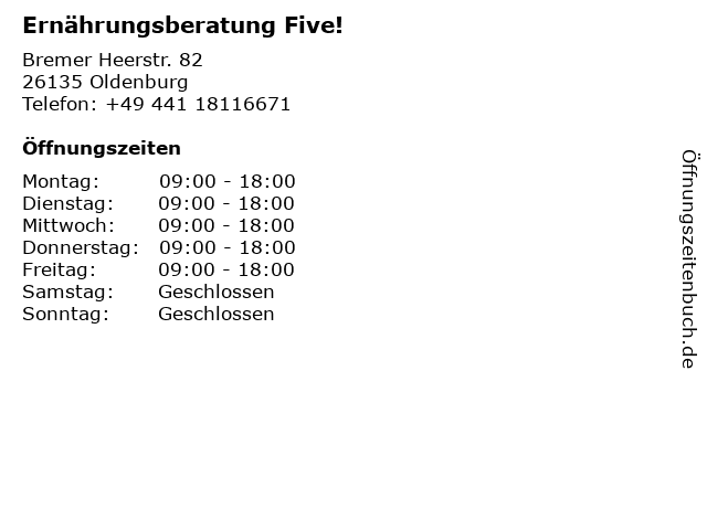 | Öffnungszeiten Ernährungsberatung Five! in Oldenburg anzeigen | |