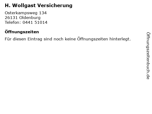 | Öffnungszeiten H. Wollgast Versicherung in Oldenburg anzeigen | |