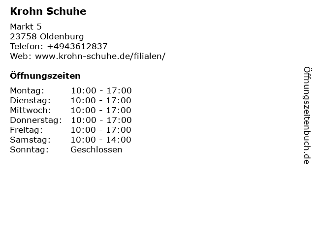 | Öffnungszeiten Krohn Schuhe in Oldenburg anzeigen | |
