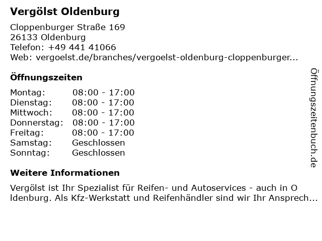 | Öffnungszeiten Vergölst Oldenburg in Oldenburg anzeigen | |