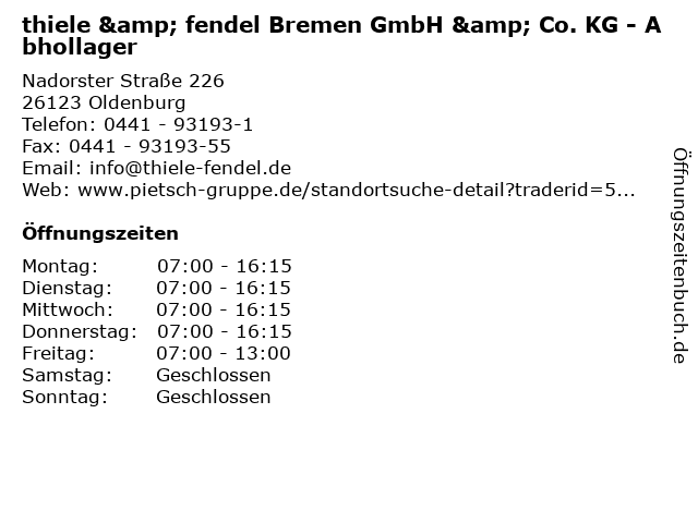 1 thiele & fendel Bremen GmbH & Co. KG - Verkauf (Entfernung: 0,00 km) Nadorster Straße 226, 26123 Oldenburg 2 badpunkt Badaustellung - thiele & fendel Bremen GmbH & Co. KG (Entfernung: 0,01 km) Nadorster Straße 226, 26123 Oldenburg 4 badpunkt Badaustellung - thiele & fendel Bremen GmbH & Co. KG (Entfernung: 31,43 km) Heidkamp 27-29, 27721 Ritterhude 5 badpunkt Badaustellung - thiele & fendel Bremen GmbH & Co. KG (Entfernung: 38,27 km) Duckwitzstraße 86, 28199 Bremen 6 |