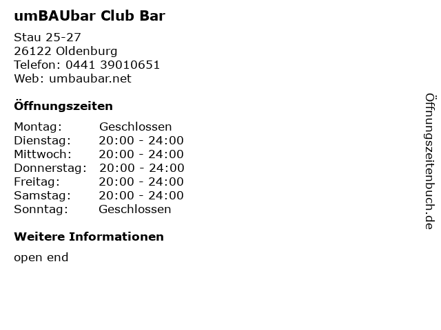 | Öffnungszeiten umBAUbar Club Bar in Oldenburg anzeigen | |