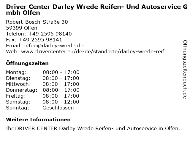 Branchen & Suchbegriffe zu Driver Center Darley Wrede Reifen- Und Autoservice Gmbh Olfen:autoservice, center, darley, driver, felgen, kfz-zubehör, reifen, reifeneinlagerung, reifenwechsel, saisonwechsel, schläuche, wrede |