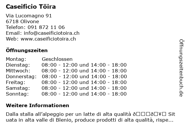 | Öffnungszeiten Caseificio Töira in Olivone anzeigen | |