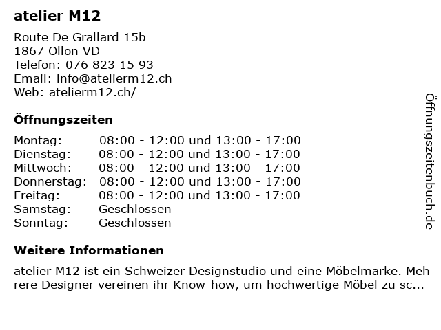 | Öffnungszeiten atelier M12 in Ollon VD anzeigen | |