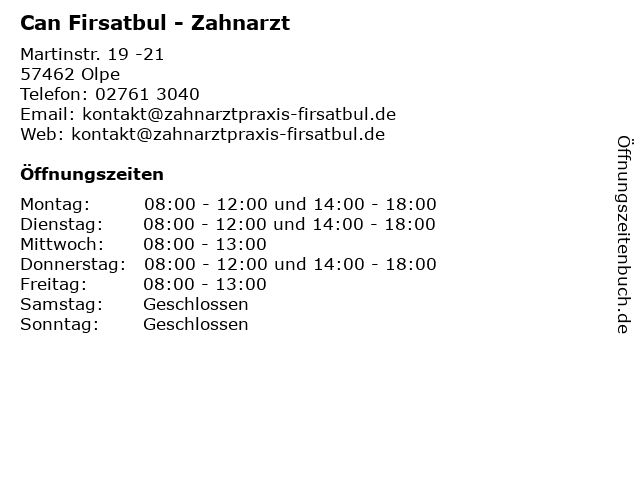| Öffnungszeiten Can Firsatbul - Zahnarzt in Olpe anzeigen | |