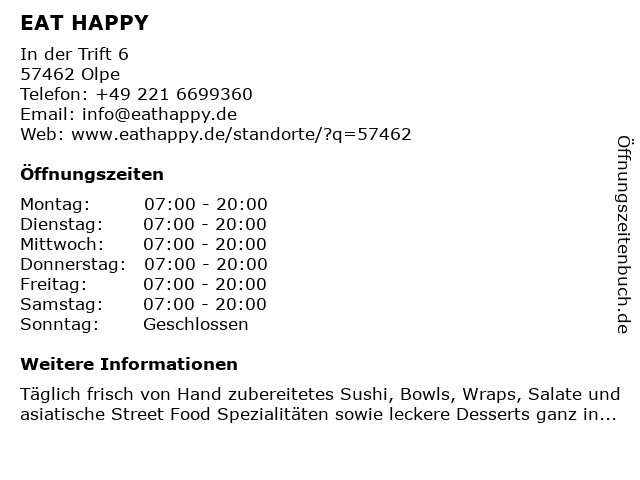 | Öffnungszeiten EAT HAPPY in Olpe anzeigen | |