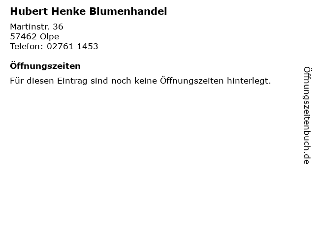 | Telefonnummer Hubert Henke Blumenhandel in Olpe (02761 1453) anrufen | |