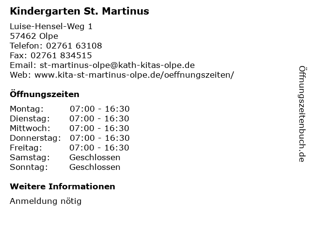 | Öffnungszeiten Kindergarten St. Martinus in Olpe anzeigen | |