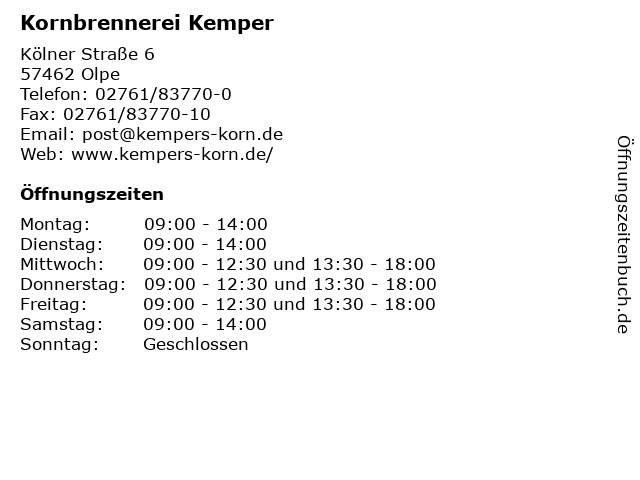 | Öffnungszeiten Kornbrennerei Kemper in Olpe anzeigen | |