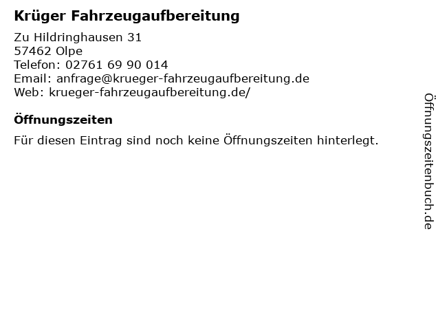 | Öffnungszeiten Krüger Fahrzeugaufbereitung in Olpe anzeigen | |