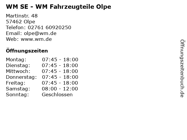 | Öffnungszeiten WM SE - WM Fahrzeugteile Olpe in Olpe anzeigen | |