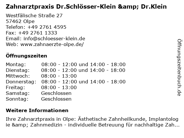 1 Zahnarztpraxis Peter Guntermann - Zahnarzt und Fachzahnarzt Oralchirurgie (Entfernung: 0,06 km) Westfälische Str. 18, 57462 Olpe 3 Zahnarztpraxis Dr. med. dent. Ludger Schröder (Entfernung: 0,24 km) Westfälische Straße 3, 57462 Olpe 6 |