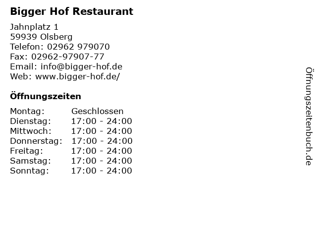 | Öffnungszeiten Bigger Hof Restaurant in Olsberg anzeigen | |