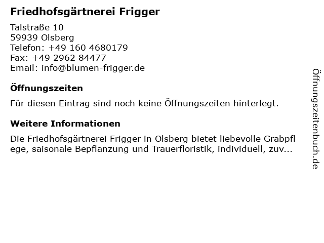 | Öffnungszeiten Friedhofsgärtnerei Frigger in Olsberg anzeigen | |