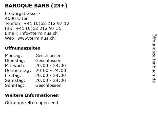 | Öffnungszeiten BAROQUE BARS (23+) in Olten anzeigen | |
