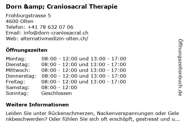| Öffnungszeiten Dorn & Craniosacral Therapie in Olten anzeigen | |