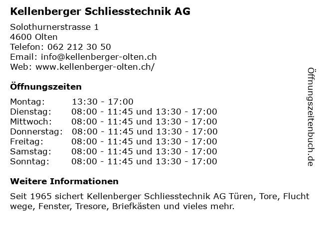 1 Kellenberger Schliesstechnik & Schlüsselservice (Entfernung: 0,01 km) Solothurnerstrasse 1, 4600 Olten 5 Kellenberger AG Schreinerei und Küchenbau (Entfernung: 11,52 km) Industriestrasse 10, 5036 Oberentfelden 6  |