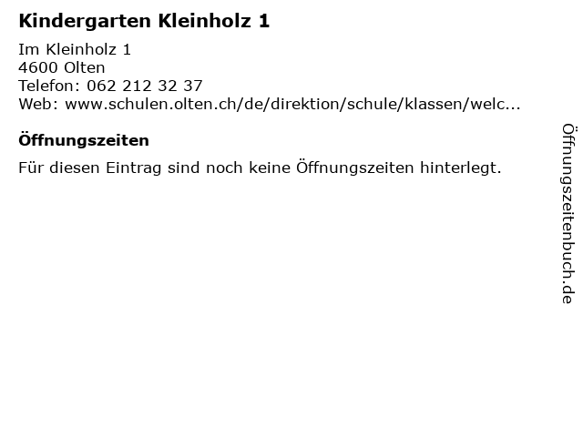 | Öffnungszeiten Kindergarten Kleinholz 1 in Olten anzeigen | |