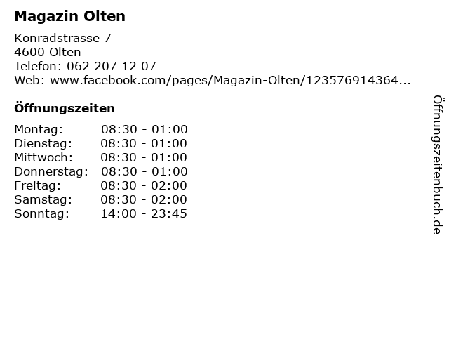 | Öffnungszeiten Magazin Olten in Olten anzeigen | |