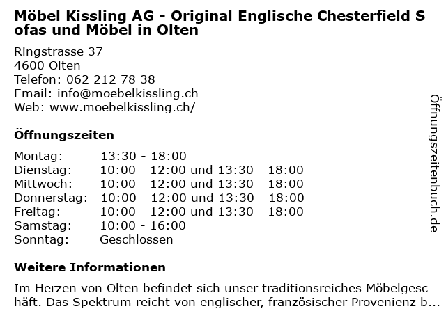 1 Möbel Kissling AG - Original Englische Chesterfield Sofas und Möbel in Olten (Entfernung: 0,01 km) Ringstrasse 37, 4600 Olten 6 |