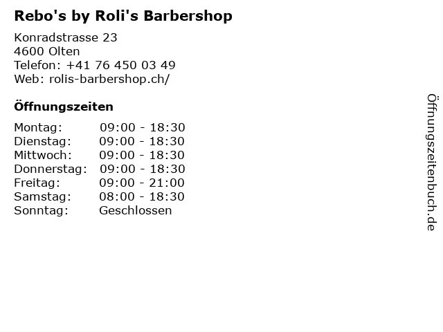 | Öffnungszeiten Rebo's by Roli's Barbershop in Olten anzeigen | |