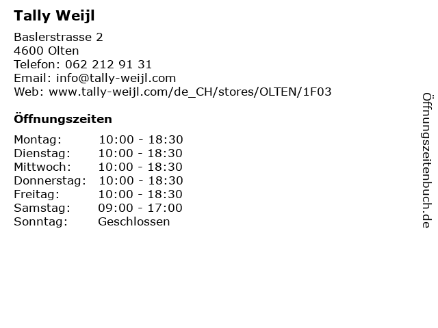 | Öffnungszeiten Tally Weijl in Olten anzeigen | |