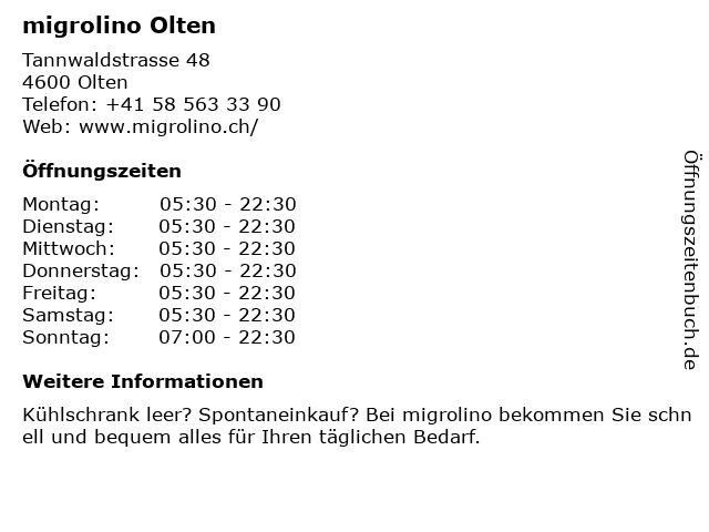 | Öffnungszeiten migrolino Olten in Olten anzeigen | |