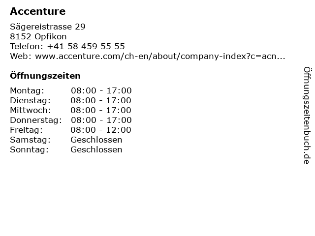 | Öffnungszeiten Accenture in Opfikon anzeigen | |