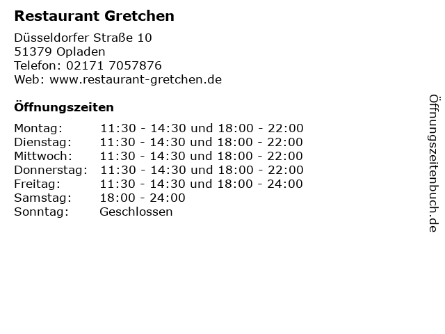 | Öffnungszeiten Restaurant Gretchen in Opladen anzeigen | |