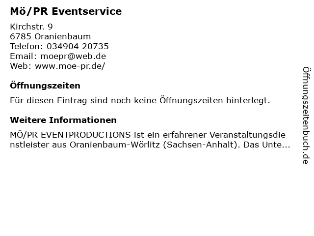 | Öffnungszeiten Mö/PR Eventservice in Oranienbaum anzeigen | |