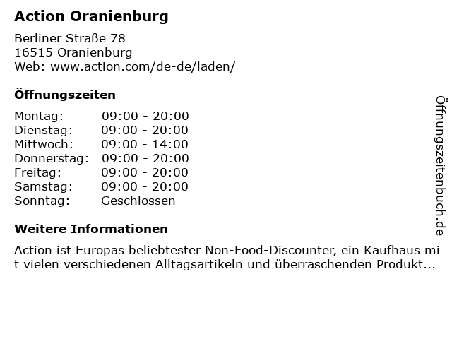 | Öffnungszeiten Action Oranienburg in Oranienburg anzeigen | |