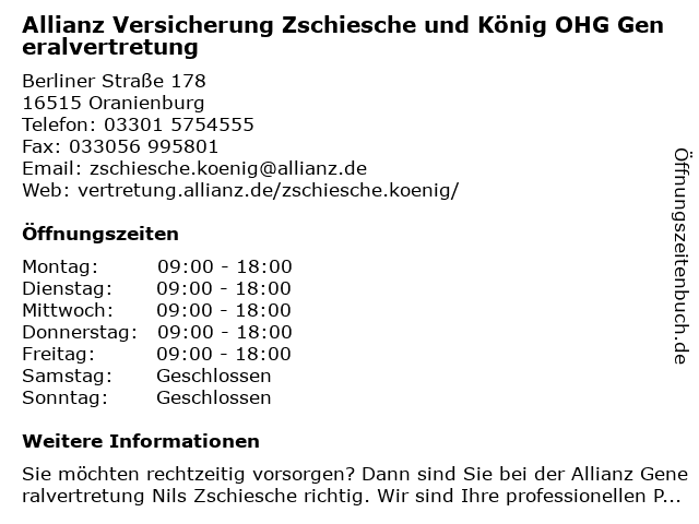 1 Allianz Versicherung Nils Zschiesche Generalvertretung in Oranienburg (Entfernung: 0,00 km) Berliner Straße 178, 16515 Oranienburg 2 Allianz Versicherung Robert Seibold Generalvertretung (Entfernung: 1,84 km) Lehnitzstraße 35, 16515 Oranienburg 3 Allianz Versicherung Robert Seibold Generalvertretung (Entfernung: 1,85 km) Lehnitzstraße 35, 16515 Oranienburg 4 Mecklenburgische Versicherungsgruppe - Bezirks-Generalvertretung Sven Pichowsky & Generalvertretung Axel Rabuske & Hauptvertretung Fabio-Lee Heinrich (Entfernung: 1,87 km) Breite Straße 11, 16515 Oranienburg 5 Mecklenburgische Versicherungsgruppe - Generalvertretung Gabriele Schilling (Entfernung: 6,09 km) Clara-Zetkin-Str. 16, 16547 Birkenwerder 6 |