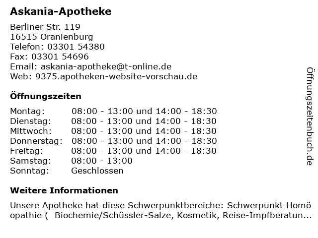 | Öffnungszeiten Askania-Apotheke in Oranienburg anzeigen | |