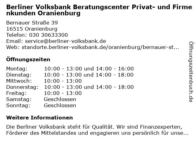 Branchen & Suchbegriffe zu Berliner Volksbank Beratungscenter Privat- und Firmenkunden Oranienburg:bankomat, beratungscenter, berliner, firmenkunden, immobilienagenturen, privat, versicherungsagentur, volksbank |