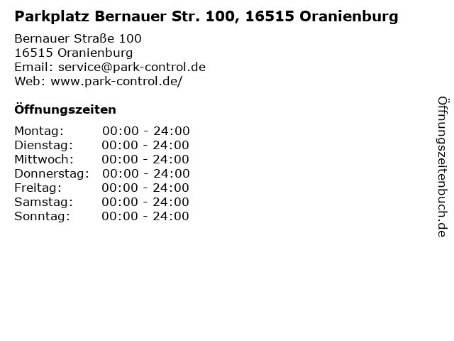 | Öffnungszeiten Parkplatz Bernauer Str. 100, 16515 Oranienburg in Oranienburg anzeigen | |