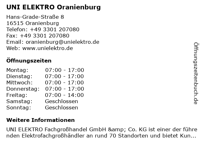| Öffnungszeiten UNI ELEKTRO Oranienburg in Oranienburg anzeigen | |